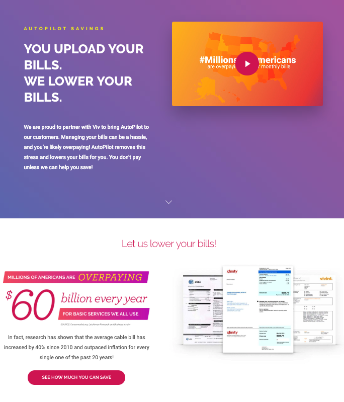This is a great share page for Viv Affiliates to use when talking to customers about everything AutoPilot can do to lower monthly bills for essential services like cable, Internet, wireless and electricity. It includes everything they need to know about our bill negotiating services and monthly automatic switching platform for electricity, powered by Utiliz, and includes links to your personal website for enrollment focused on AutoPilot.